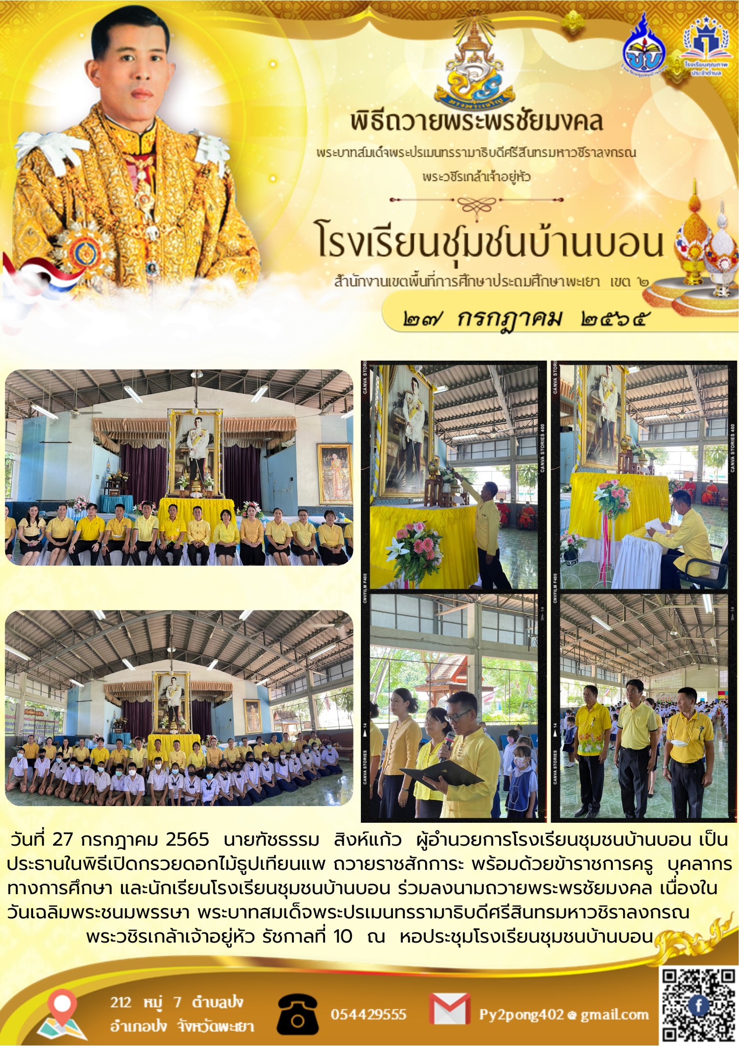 วันที่ 27 กรกฎาคม 2565 นายฑัชธรรม สิงห์แก้ว ผู้อำนวยการโรงเรียนชุมชนบ้านบอน เป็นประธานในพิธีเปิดกรวยดอกไม้ธูปเทียนแพ ถวายราชสักการะ พร้อมด้วยข้าราชการครู บุคลากรทางการศึกษา และนักเรียนโรงเรียนชุมชนบ้านบอน ร่วมลงนามถวายพระพรชัยมงคล เนื่องใน วันเฉลิมพระชนมพรรษา พระบาทสมเด็จพระปรเมนทรรามาธิบดีศรีสินทรมหาวชิราลงกรณ พระวชิรเกล้าเจ้าอยู่หัว รัชกาลที่ 10 ณ หอประชุมโรงเรียนชุมชนบ้านบอน