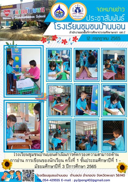 ข่าวสาร/ประชาสัมพันธ์ วันที่ 12 กรกฎาคม 2565 โรงเรียนชุมชนบ้านบอนดำเนินการคัดกรองความสามารถด้านการอ่าน การเขียนของนักเรียน ครั้งที่ 1 ชั้นประถมศึกษาปีที่ 1 - มัธยมศึกษาปีที่ 3 ปีการศึกษา 2565